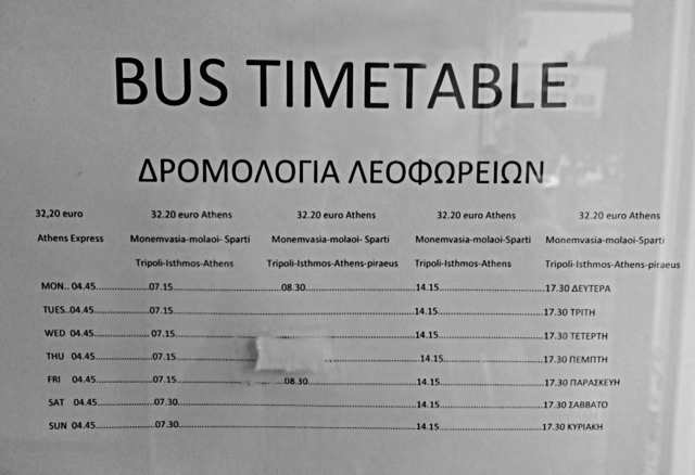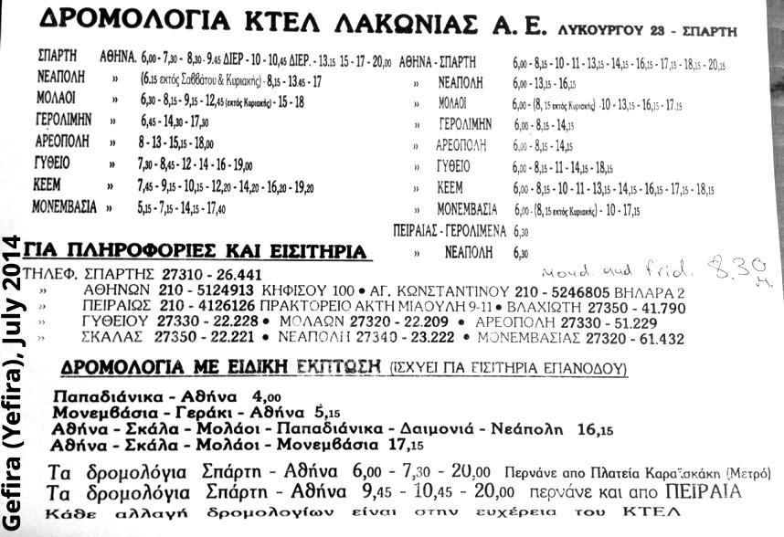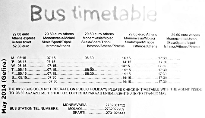 Busfahrplan Athen - Monemvasia von Februar 2014 vom Fahrkarten-Schalter in Athen, von der Station "Kifisos" (KTEL Athens Bus Station, Terminal A, Geokoordinaten 37.998, 23.699), wo Überlandbusse abfahren/ankommen. Die Station ist vom Flughafen mit dem Öffentlichen Nahverkehr in 1,5 Std., mit dem Taxi in ca. 30 Min. erreichbar.