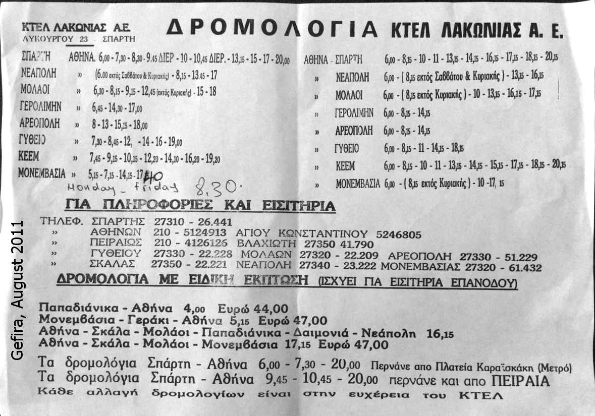 (Athens - Isthmos - Tripoli - Sparti - Skala - Molaoi - Monemvasia: i.R. ca. 5 Stunden Monemv. bis Isthmos), ca. € 32,50.