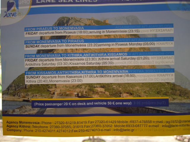 Athen (Piraeus, Dep. Fr., 18:00 Uhr) - Monemvasia - Kithira - Kreta. Die, bis Monemvasia 5:30 stündige Schiffsfahrt,